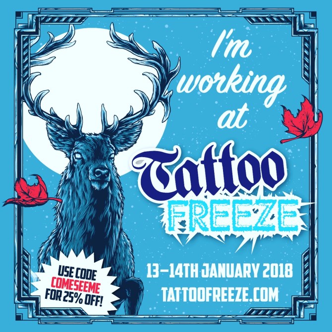 I’m working tattoo freeze next weekend and still have a couple of slots if you fancy getting a piece give me a shout get discounts on tickets with the code in the photo