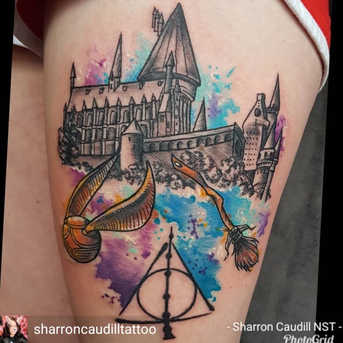 @Regrann from @sharroncaudilltattoo – Got to do this cool #watercolourtattoo today at @electriccitytattoomcr #harrypottertattoo #hogwarts #snitch #broomstick #nimbus2000 #deathlyhallowstattoo