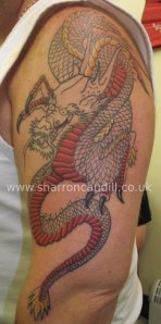 The next piece is part of a Japanese sleeve I am working on. The dragon will eventually have windbars, clouds and cherry blossom as its background and will green in colour. I am looking forward to finishing this one too.