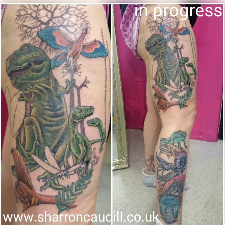Got another session in on this bad ass leg piece this week. Trex and lower leg healed. We always end up talking about the subject matter me and Helen while doing this and this time I have come to the conclusion that trex are just massive kangaroos!